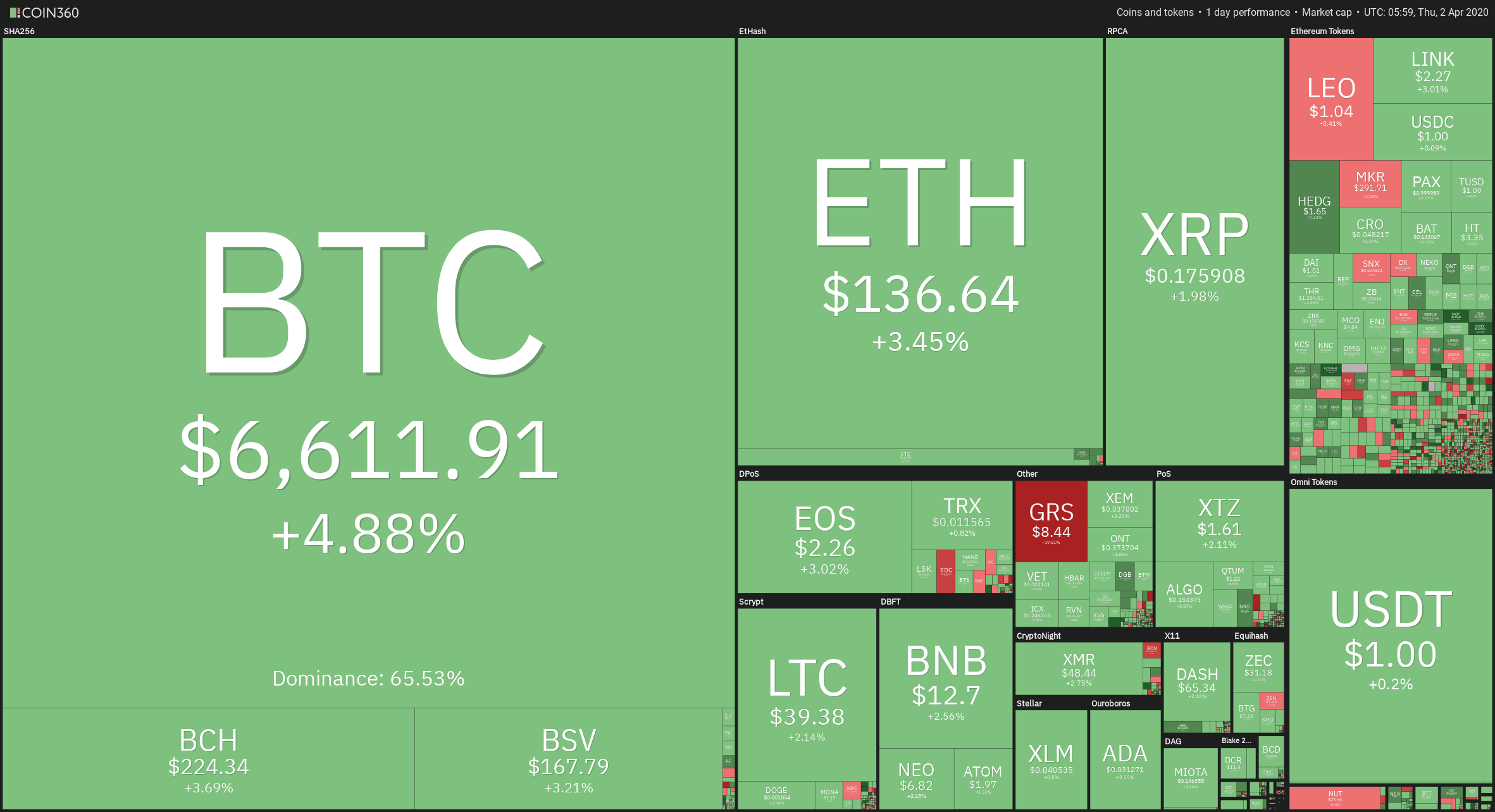 After 24 hours of continuous descents, Bitcoin(+4.88%) had recovered the whole drop in a single bullish candlestick that recovered all the losses and made a new high. The upward movements were relatively similar on major cryptos and altcoins, with BCH (+3.69%), ETH (+3.45%), and EOS (+3.02%) being the closest to the BTC movement. GRS (-19.56%), after its galactic ascent of over seven thousand percent yesterday, there is no surprise that it is retracing part of the acquired gains, being the worst performer of the top-20 coins. HEDG (+7.22%) is leading the profits of the most capitalized Ethereum-based tokens, followed by LINK (+3.05%) and BAT(+2.86%). Today's notable mention should be awarded to ECOREAL, which is up +863 percent.
