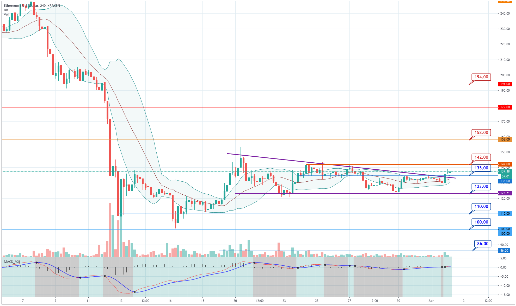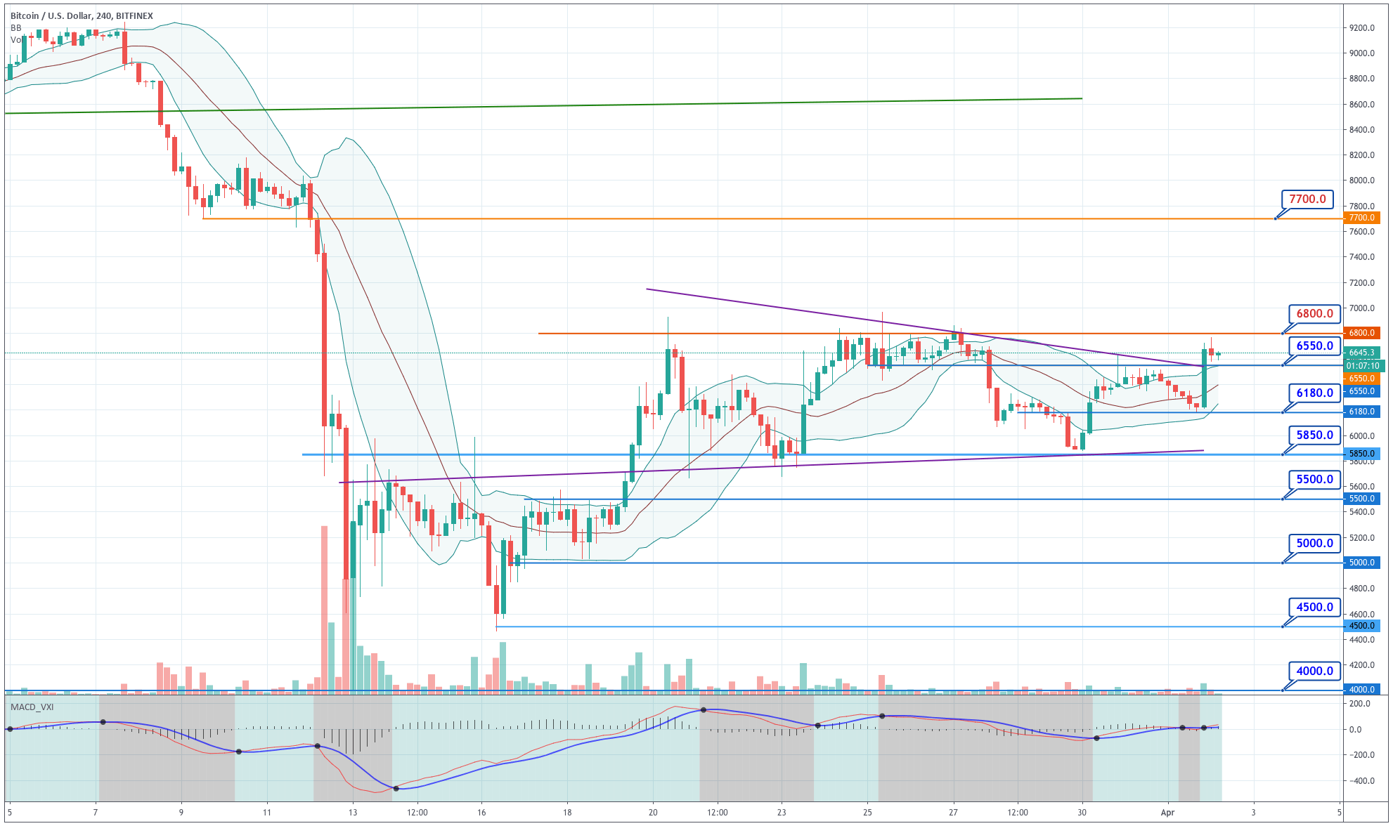 Bitcoin made a large bullish candlestick that engulfed the previous eight bearish candles, broke through the $6,550 level, and made a new high near $6,800. The price is now above the +1SD Bollinger line, and its MACD turned to bullish too. Finally, this movement has broken the horizontal wedge to the upside. This is what we were looking for in terms of a directional clue. Right now, the price is consolidating its gains, but this strong move will set the pace for today's and tomorrow's movement on BTC and the crypto sector.