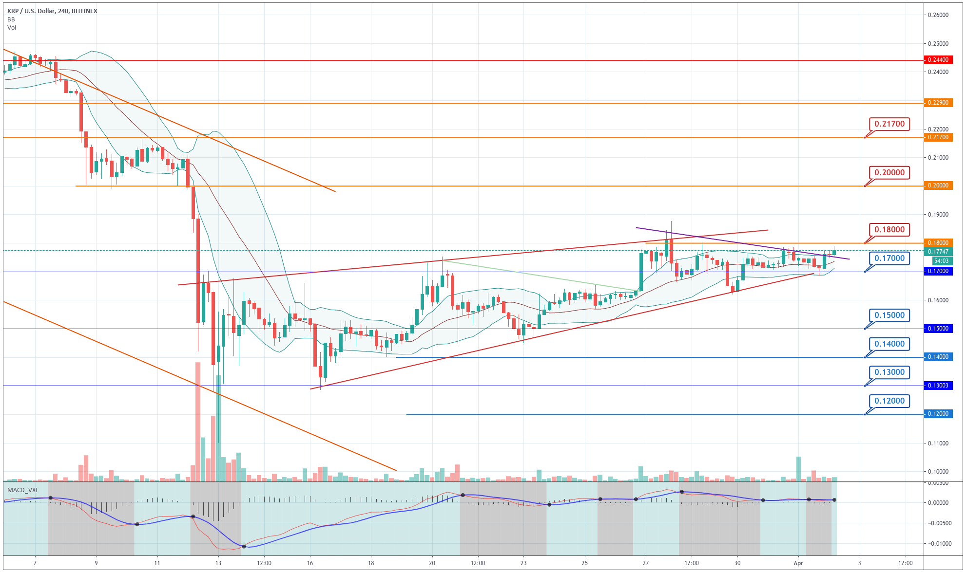 Ripple has made a kind of morning star formation whose bullish candle pierced through the second-previous bearish candle's high and also crossed the upper descending trendline of the triangular structure slightly. The next current candle continues its upward move above the +1SD line and with a MACD making a bullish transition. Although XRP's move is not as convincing as on BTC and ETH, we estimate that XRP has a slightly upward bias, that may be helped by the overall market mood.