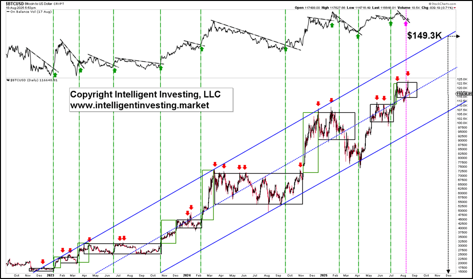Lastly, the red down-pointing arrows indicate that each consolidation results in false breakouts. We just experienced one on August 14. Only the February-March consolidation of this year was resolved lower, but Bitcoin stayed within its uptrend channel and has rallied multiple times to new ATHs since then. Therefore, follow the trend, the four-year cycle, the Elliott Wave, and our long-term trading system signal. None of these has yet signaled that the top is in.