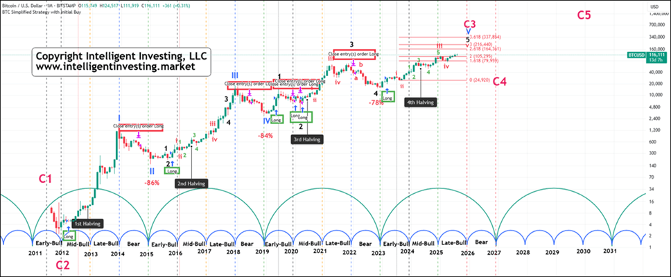 Figure 1. Bitcoin’s monthly price chart with our preferred EW count, four-phases cycle, and trading system signals