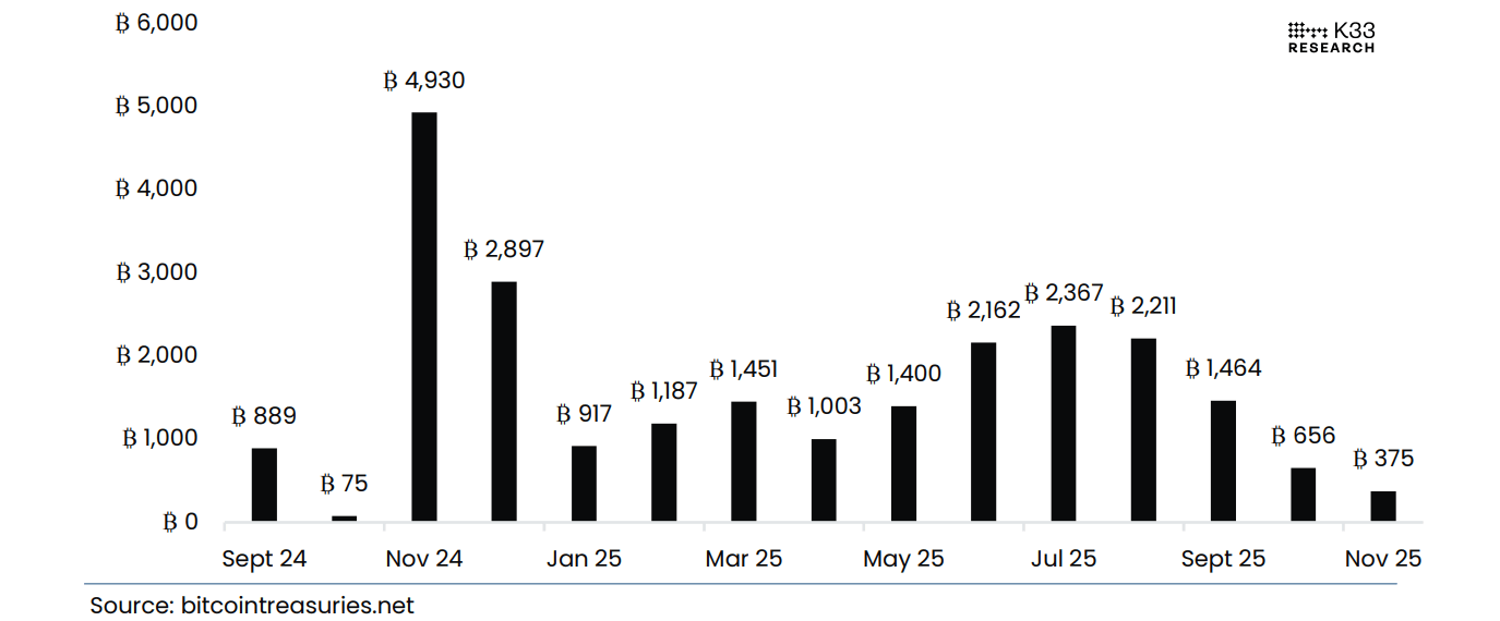 - Bitcoin average daily purchases by public companies reached a one-year low of 656 BTC in October, with demand plunging further in November.