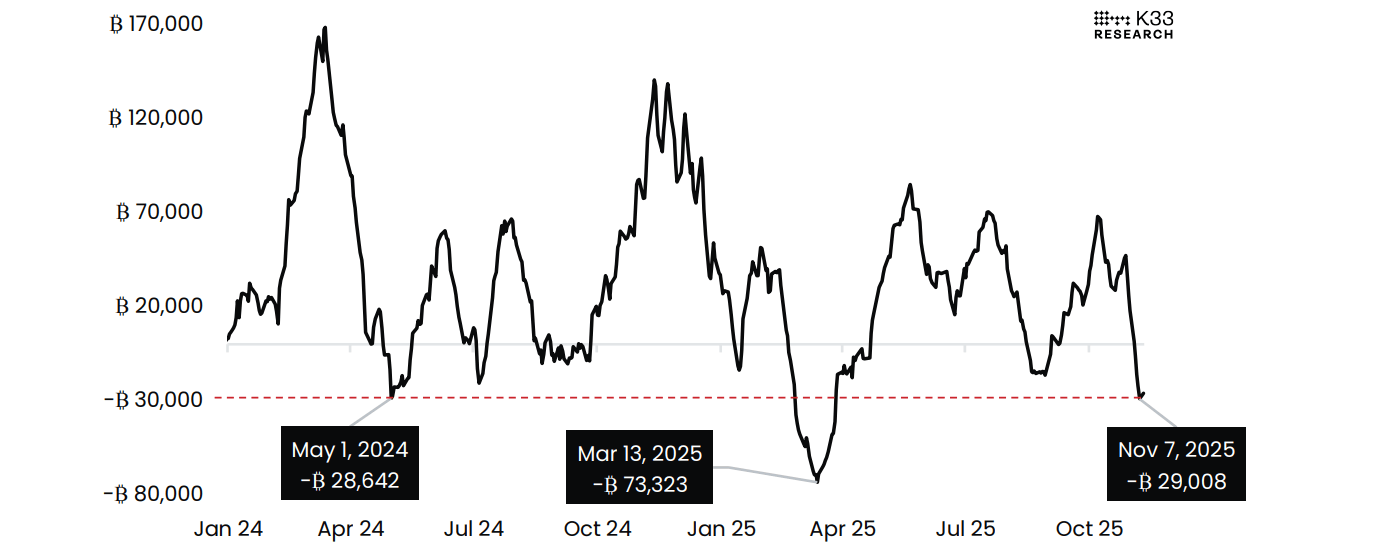 The trend has sparked increased caution from investors. Since the October 10 leverage flush, Bitcoin investment products have seen outflows of 29,008 BTC as of Monday, "marking the worst 30-day flow since March 2025 and weaker flows than any period in 2024," according to K33. However, the analysts noted that the recent outflows are "a temporary reflection of de-risking and expect 30-day flows to trend higher from here, with 30-day flows of -29,008 BTC marking the bottom for H2 2025."