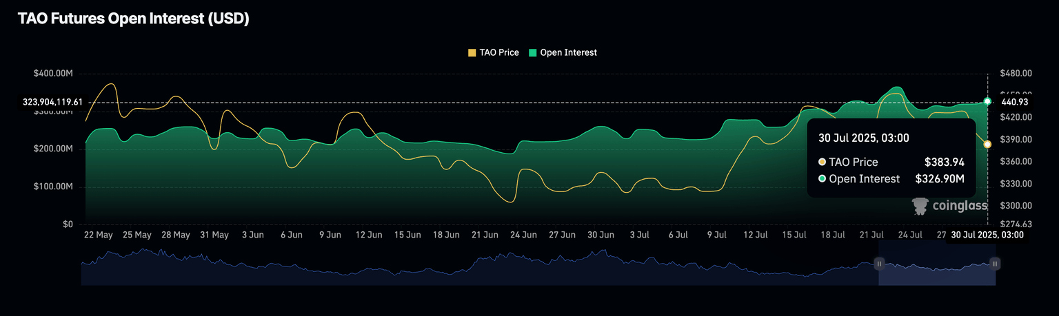 TAO is down over 4% on the day, trading at $368 at the time of writing as bulls search for a robust support toward $350. Despite the correction from July peak levels of $499, the futures Open Interest (OI) remains relatively high at $384 million, up slightly from $365 million.
