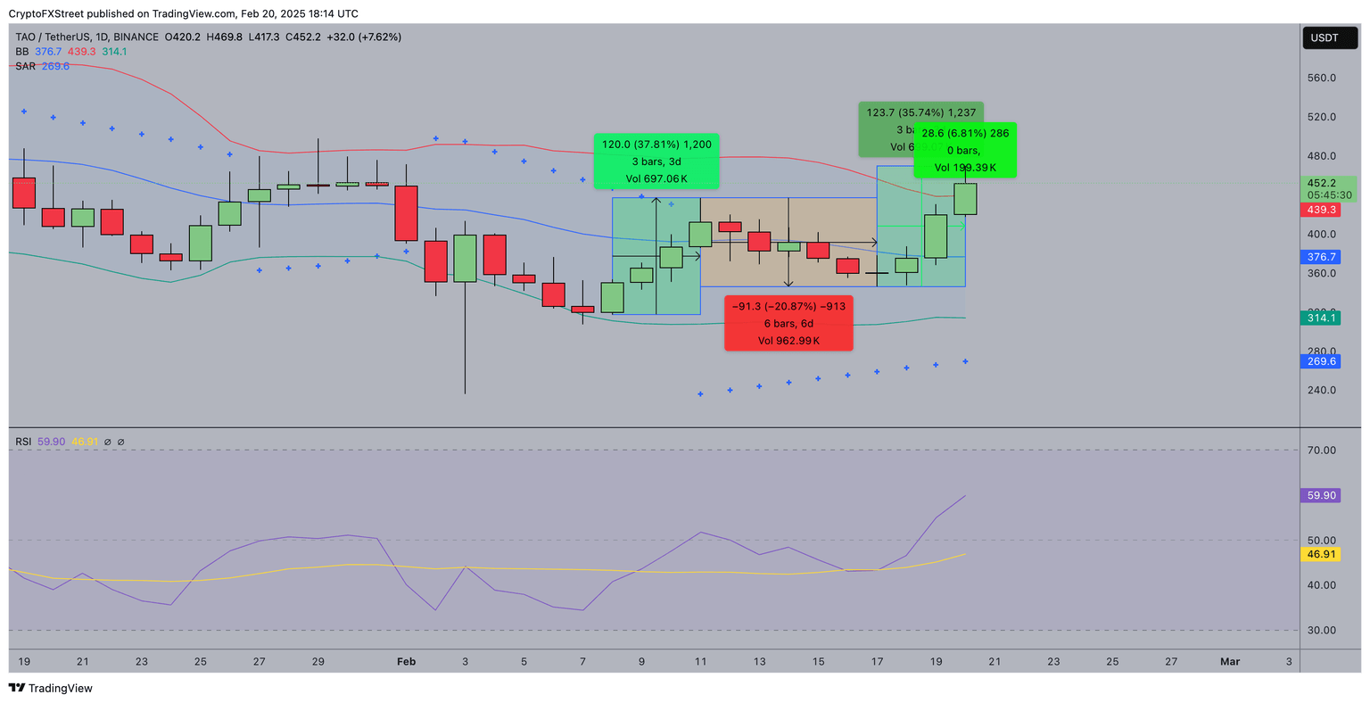 Within 24 hours of the announcement, TAO price gained an additional 6%, pushing its three-day gains to 35% and reaching a 30-day peak of $469.80.