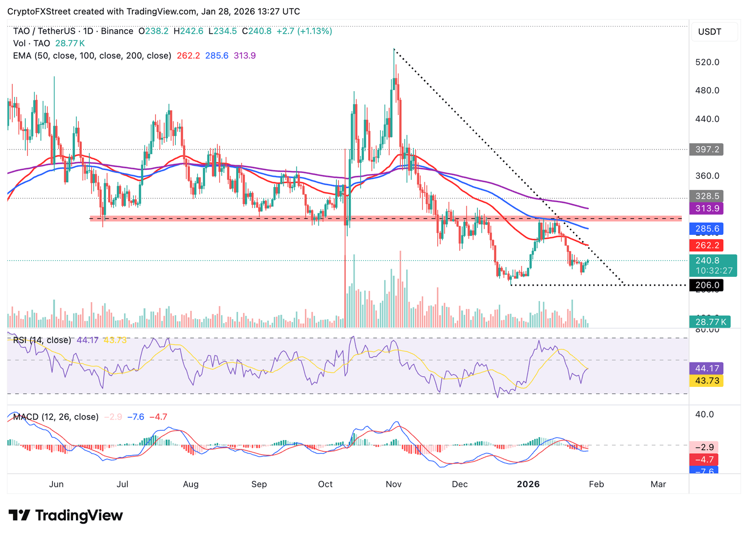 The 50-day Exponential Moving Average (EMA) caps the upside at $262, posing as a threat to TAO’s rebound. A decisive break above this moving average would open the door for accelerated gains toward the 100-day EMA at $285.