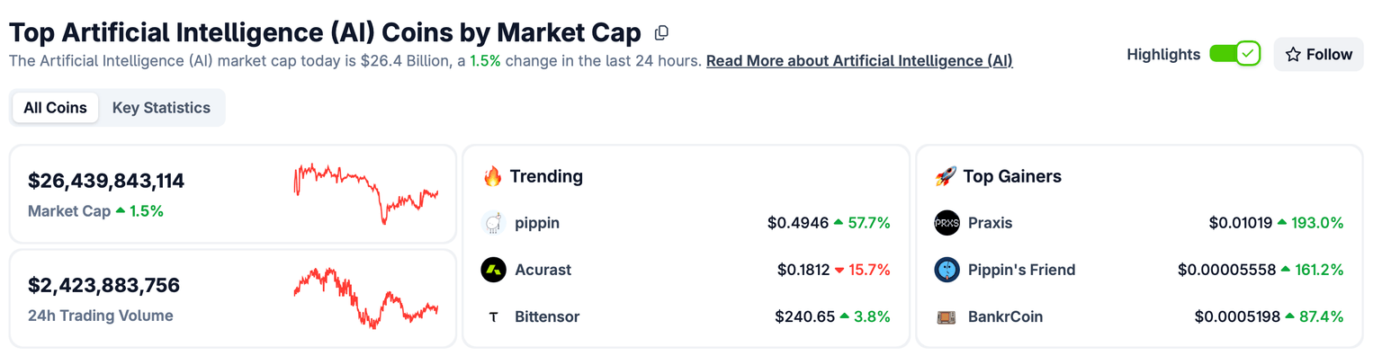 - Tokens blending AI and blockchain technologies are posting selective gains, pushing the sector’s market capitalization above $26 billion.
