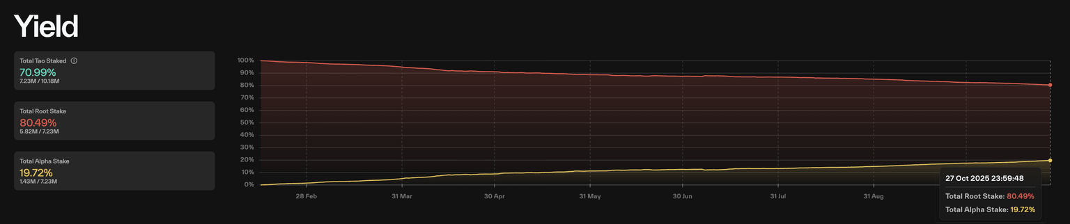 On the other hand, out of the total 7.23 million TAO tokens staked on the network, 19.72% (1.43 million tokens) have been swapped for alpha tokens, indicating that users are increasing their risk exposure to subnets.
