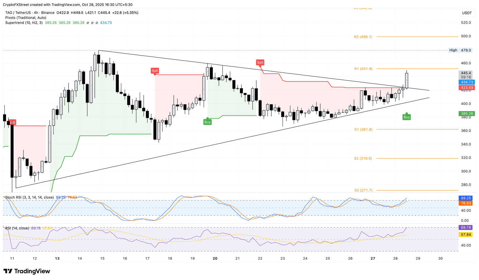 Bittensor breaks out of a symmetrical triangle pattern on the 4-hour price chart, approaching the R1 Pivot Point at $451. The breakout rally has also surpassed the red Supertrend line, indicating a renewed uptrend.