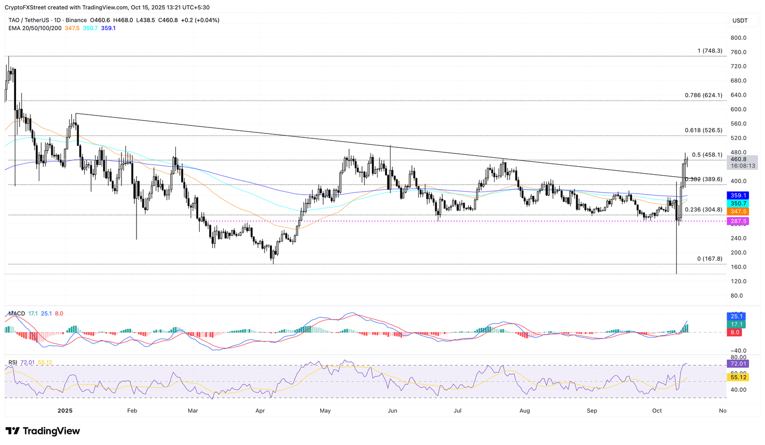 Looking down, if TAO reverses from the $458 level, it could retest the 38.2% Fibonacci retracement level at $389, threatening the $400 psychological level.