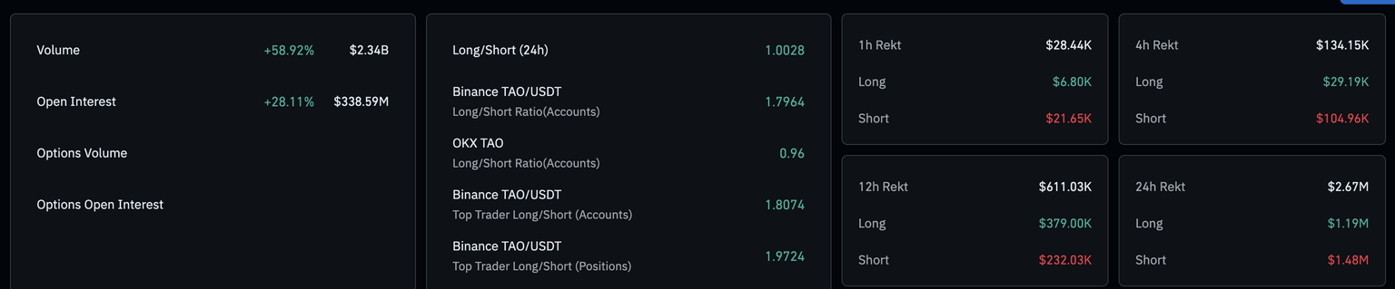 The traders’ sentiment around Bittensor in the derivatives market has returned to heightened levels after the flash crash on Friday. CoinGlass data shows that the TAO futures Open Interest (OI) stands at $338.59 million, with a 28% increase over the last 24 hours. This double-digit rise refers to an increase in the notional value of outstanding futures contracts, signaling that traders are increasing risk exposure.