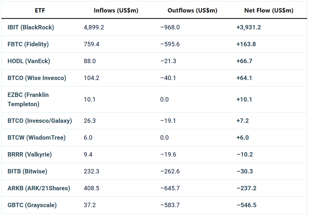 BlackRock’s IBIT fund led the surge, recording its strongest month to date with a net gain of $3.93 billion. Fidelity’s FBTC added $163.8 million, while VanEck and Invesco saw steady momentum with respective net inflows of $66.7 million and $64.1 million.
