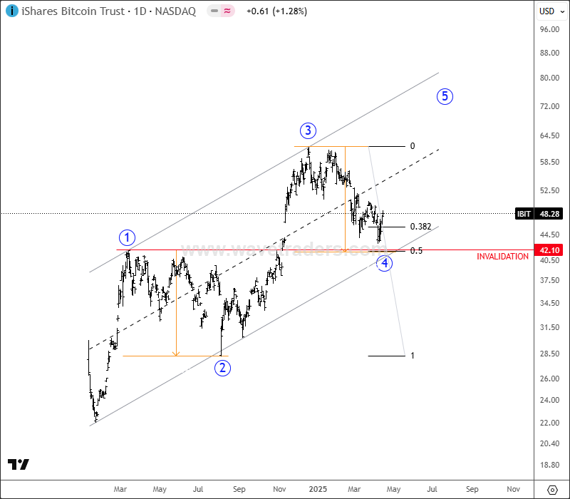 We talked about BlackRock’s Bitcoin ETF – IBIT back on April 15th with our members, where we mentioned and highlighted a completed wave 4 correction within an ongoing five-wave impulse, which can extend the rally for wave 5.