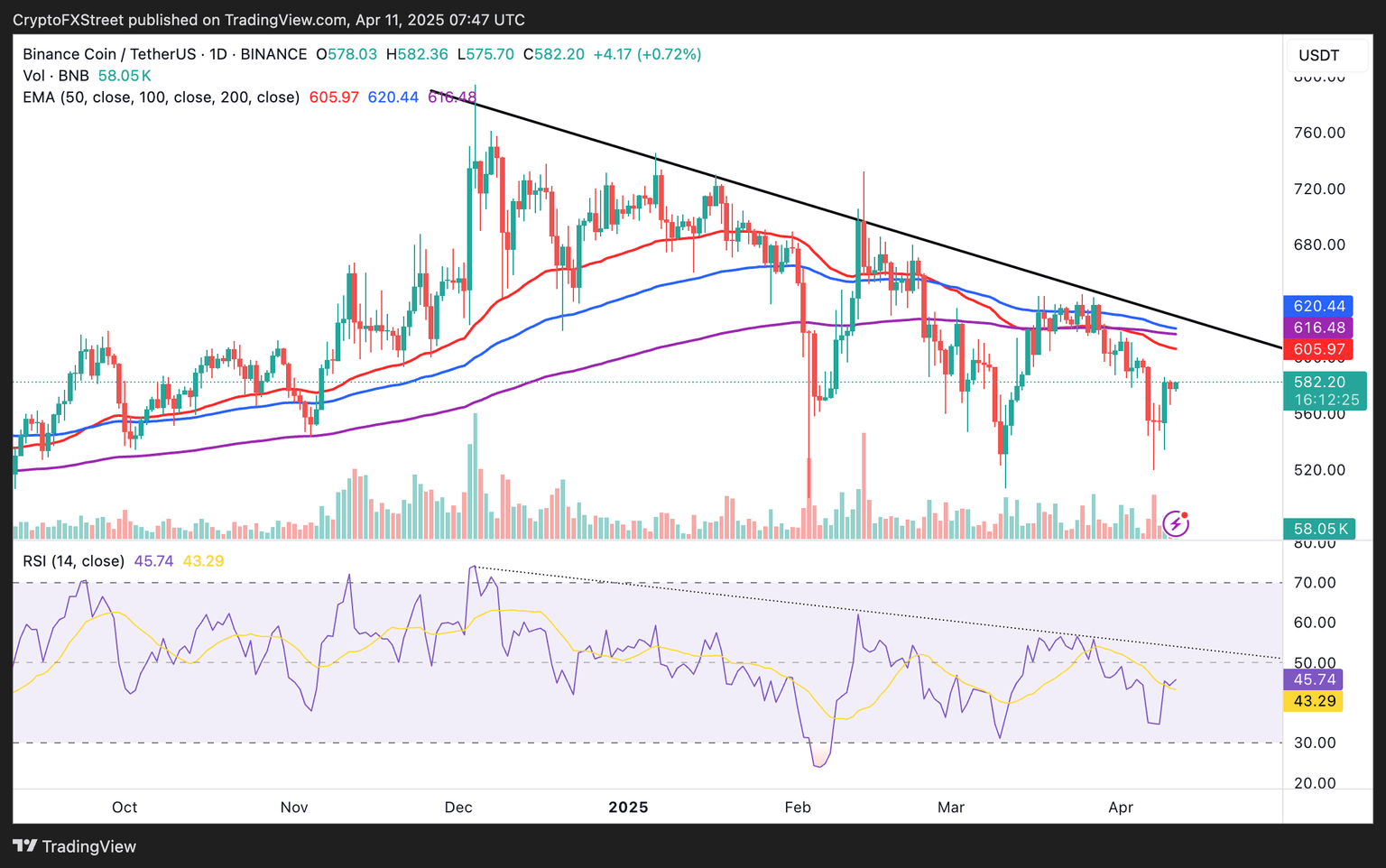 Binance Coin faces resistance at $580 at the time of writing on Friday despite the mid-week rebound triggered by US President Donald Trump’s 90-day tariff pause, following Monday’s drawdown to $520.