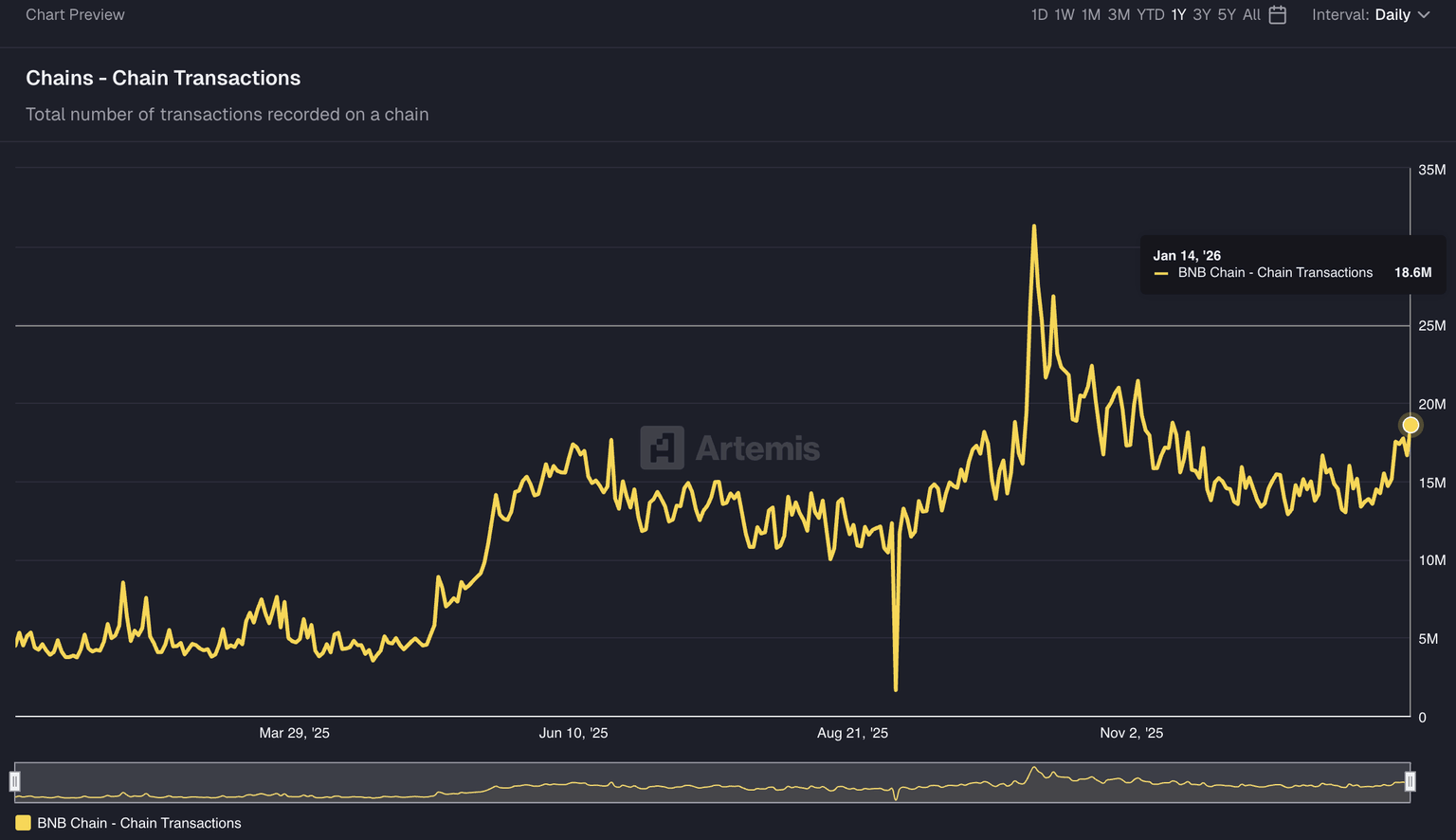 At the same time, Artemis Analytics data shows the transactions stood at 18.6 million on Wednesday, affirming renewed user activity. A steady network growth could back the demand for its native token, BNB.