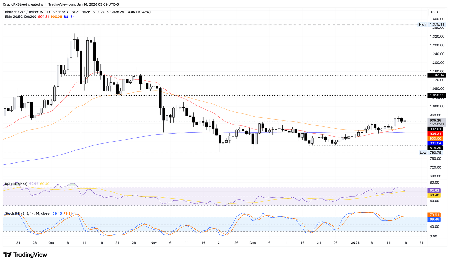 BNB price holds above key Exponential Moving Averages (EMAs), with the 20-, 50-, and 200-day EMAs rising and backing the upward bias. If the BNB recovers above $950 to clear Thursday’s pullback, it could follow toward $1,050, a crucial support level active in October now turned into resistance.