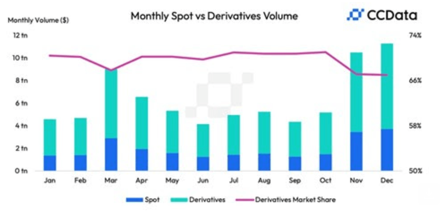 However, during the market frenzy in December 2024, CCData’s Exchange Review report. shows that combined spot and derivatives trading surged 7.58% to a record high of $11.3 trillion.