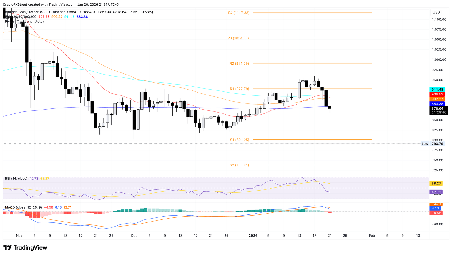 BNB price holds marginally below the 200-day Exponential Moving Average (EMA) at $883, while the 50-day EMA at $902 is sloping downward, suggesting a potential Death Cross.