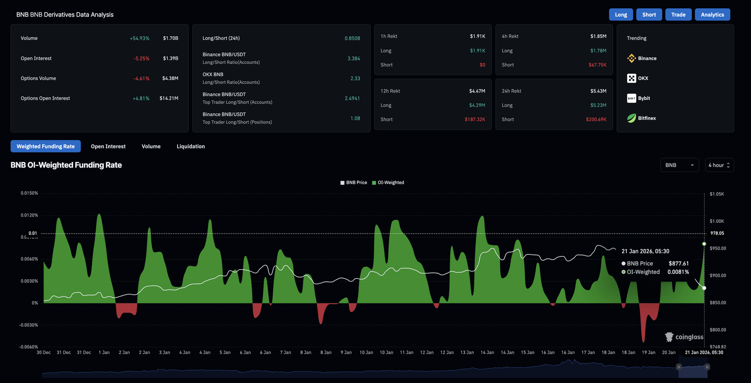 CoinGlass data shows that BNB Open Interest dropped by 5.25% to $1.39 billion over the last 24 hours, suggesting a decline in the value of outstanding futures contracts as traders close positions or reduce leverage.