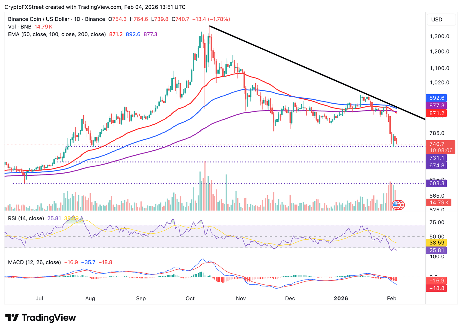 BNB is extending its decline below $750, weighed down by low retail activity as mentioned above and a weak technical structure. The 50-day Exponential Moving Average (EMA) at $871 has recently crossed below the 200-day EMA at $877, forming a Death Cross Pattern, which emphasises the bearish outlook.