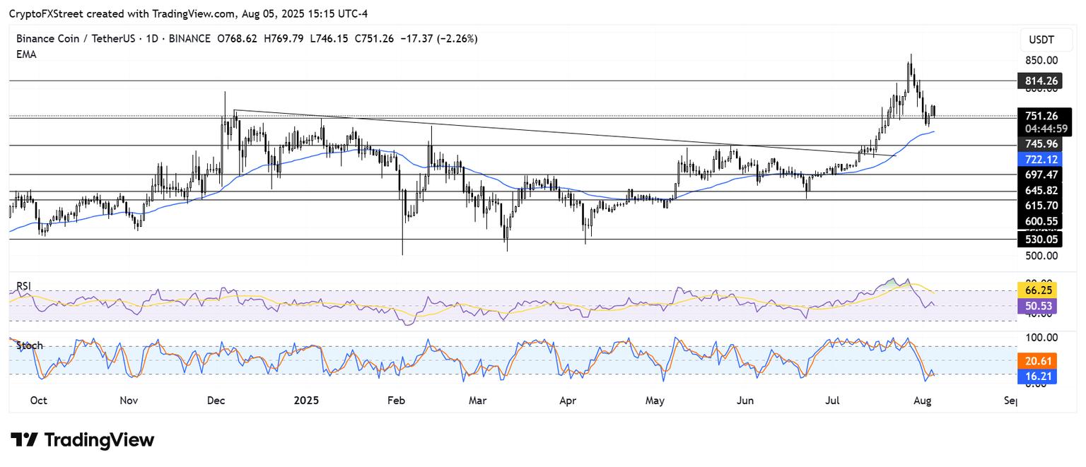 BNB is looking to find support near $745 after declining over 12% from a record high of $861 over the past week. Further down, the 50-day Exponential Moving Average (EMA) and $697 level could provide support if BNB fails to hold $745. On the upside, it could rise to retest the resistance near $814.