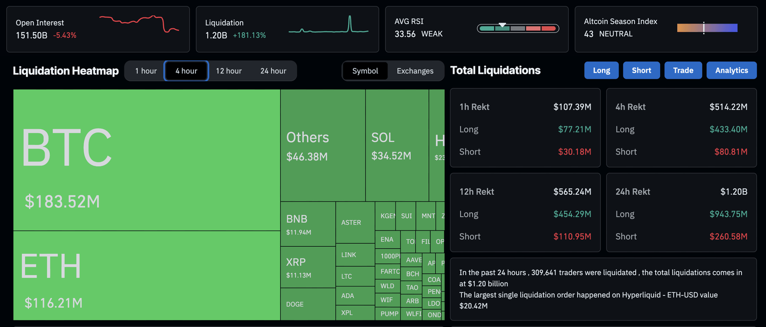 With the prices of cryptocurrencies taking a nosedive, the derivatives market witnesses a biased wipeout of largely bullish-aligned positions. CoinGlass data shows that the total liquidations account for $1.20 billion in the last 24 hours, with long liquidations of $943.75 million outpacing short liquidations of $260.58 million.