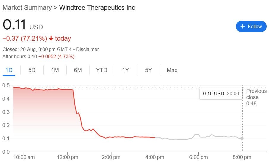Windtree (WINT) shares dropped a staggering 77.2% to $0.11 on the news, and are down another 4.7% in after-hours, Google Finance data shows. WINT shares saw a minor rise on July 16, when it announced its BNB treasury strategy, but have fallen over 90% since its July 18 peak.