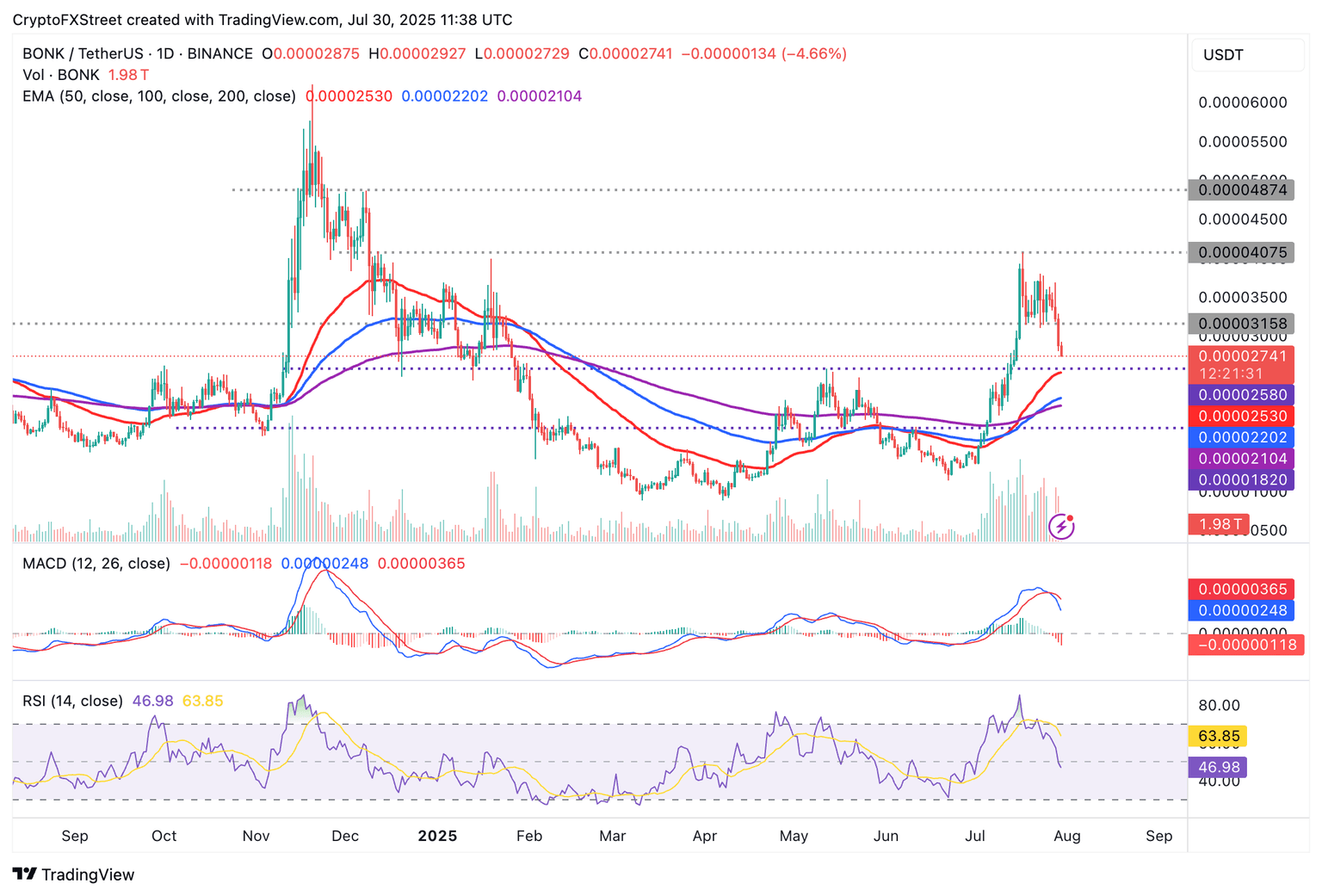 The decline in Bonk can be attributed to, among other factors, profit-taking following the remarkable 203% rally in July, which peaked at $0.00004075. More broadly, the change in market dynamics due to macroeconomic concerns on the perceived impact of the reciprocal tariffs coming into effect in the US on Friday and Wednesday's interest rate decision could also be playing a role.