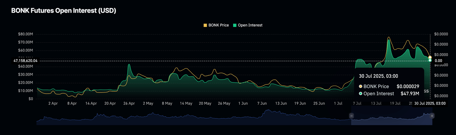 The futures weighted funding rate has also been on a steady decline to -0.0066% after peaking at 0.0256% on July 23. Low or negative funding rates indicate weak bullish sentiment, as few traders bet on the Bonk price increasing. At the same time, the decline suggests a lack of confidence in the ecosystem, or cooling speculative activity, potentially leaving Bonk susceptible to downward pressure.