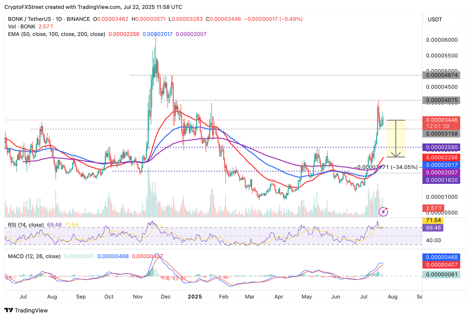 Bonk (BONK), the Solana-based meme coin, is facing headwinds on Tuesday, down nearly 2% and trading at around $0.00003446 at the time of writing. As Bitcoin (BTC) extended its rally to a new record high of $123,218 on July 14, investors aggressively bought BONK, boosting its recovery to a high of $0.00004075 reached on July 17.