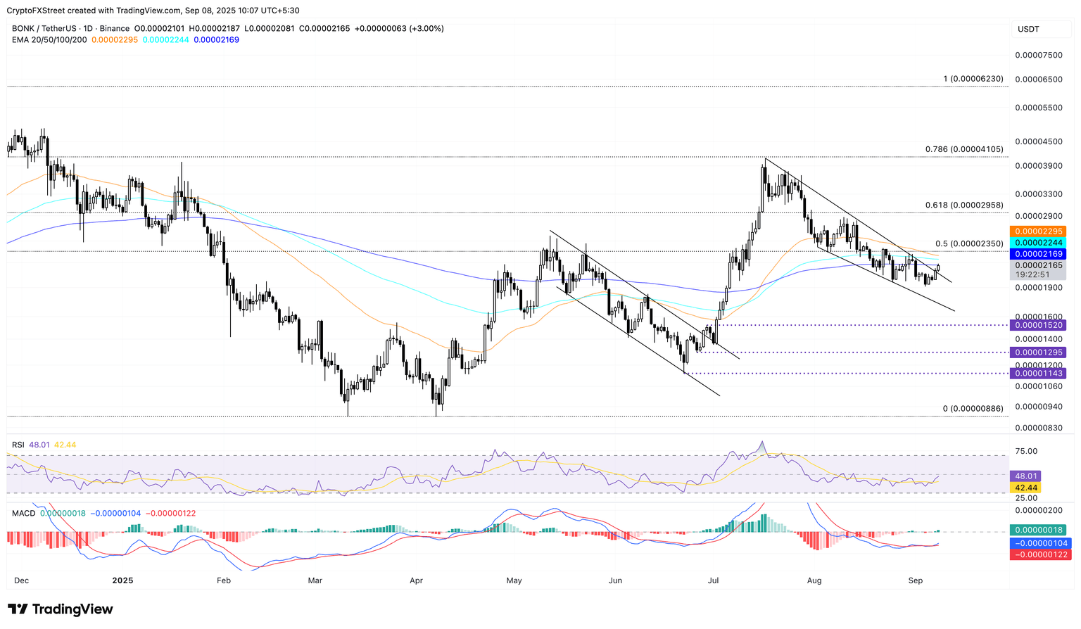 - Bonk extends the falling wedge pattern breakout by 2% on Monday, targeting the 200-day EMA.