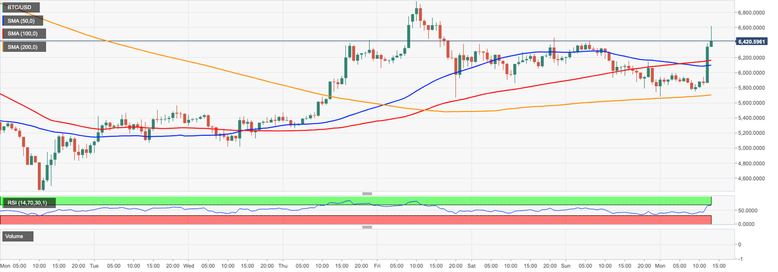 BTC/USD is on fire ahead of the US opening. A strong move above $6,000 created a strong upside momentum and pushed the price above $6,500 in a matter of minutes. At the time of writing, BTC/USD is changing hands at $6,450 with an intraday high of $6,620.