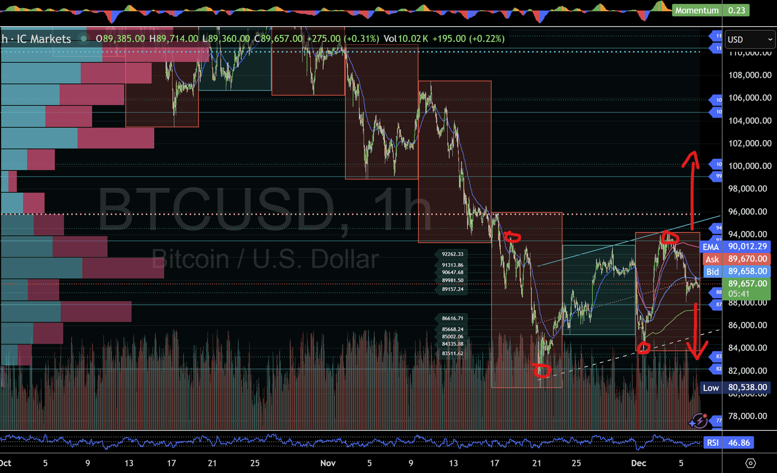 At the time of our previous update, Bitcoin traded near 93,300. As of December 7, BTC trades around 88,900, down approximately $4,400 — a move fully aligned with the expected pullback from the upper intraday pivots.