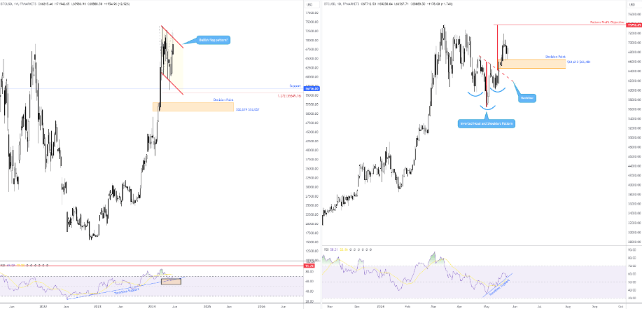 A daily decision point area at $64,612-$66,484 held ground in the second half of last week, and price has room to move higher this week towards the all-time highs/inverted head and shoulders take-profit objective at around $73,840ish. This, of course, also highlights a possible breakout above the weekly chart’s bullish flag pattern structure.