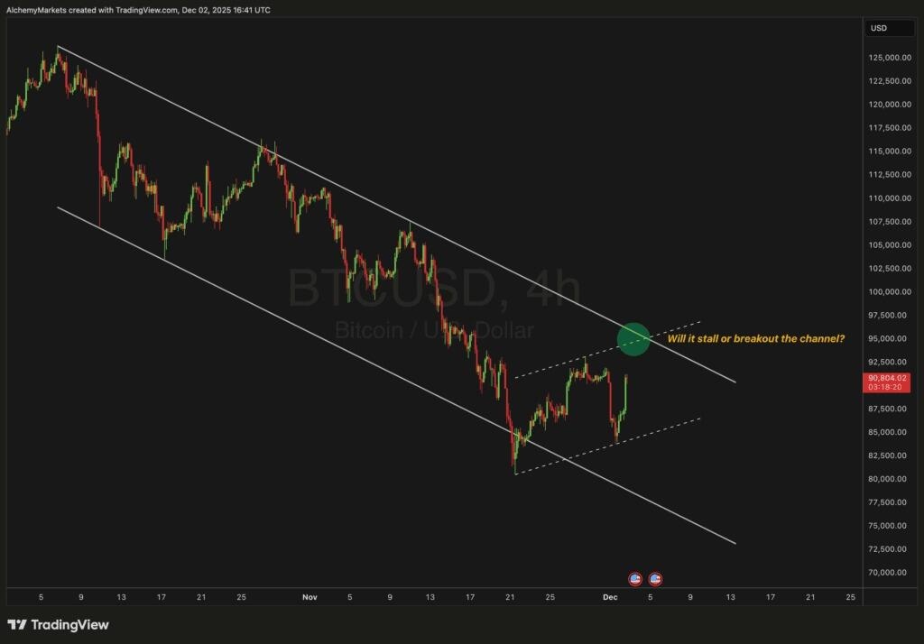 Looking at the 4-hour BTC/USD chart, price action has been trapped inside a descending channel since early October, making consistent lower highs and lower lows. But recently, things have started to change — it looks like we may have bottomed out near the lower boundary of that channel. Since then, we’ve seen a strong impulse to the upside, showing some early signs of life from the bulls.