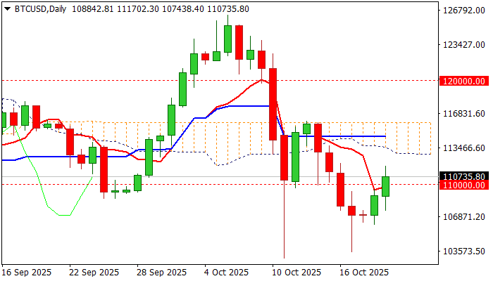 Conversely, daily close above 110K to keep near-term action biased higher, with sustained break above 111K to strengthen near-term structure, although it will be a tough job to clear key barrier, presented by daily Ichimoku cloud (spanned between 112960 and 115900), break of which is needed to bring bulls fully in play.