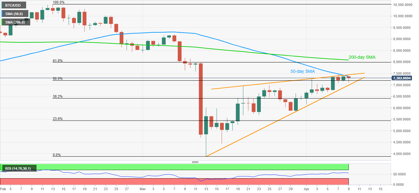 While stepping back from 50-day SMA, BTC/USD takes rounds to 7,305 amid early Friday. Even so, the crypto leader stays inside the rising wedge bearish technical formation.
