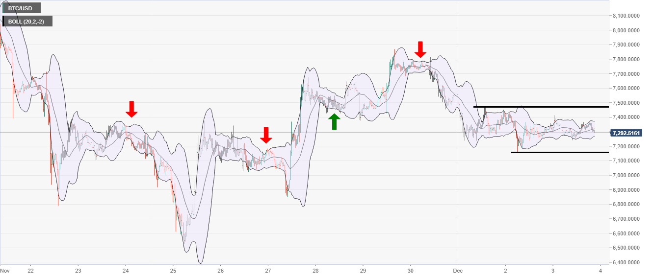 Over the last two days, the price of BTC/USD has consolidated into a very tight range between 7,161.94 and 7,469.60