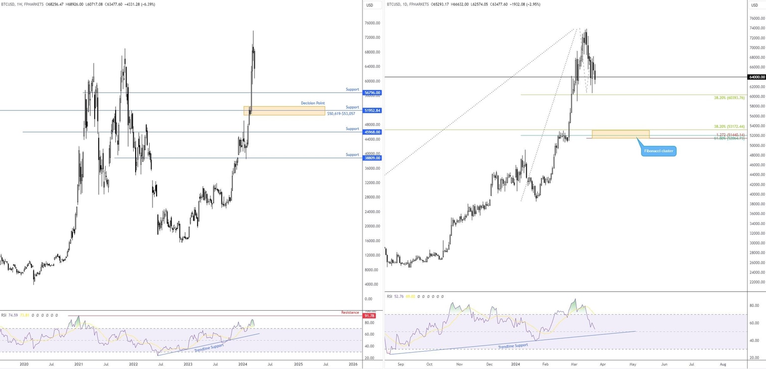 Interestingly, should further underperformance draw price action through weekly support, the weekly decision point at $50,619-$53,057 would likely be the next downside objective for sellers. However, given that this area is complemented by the daily chart’s Fibonacci cluster, this may be a zone where serious dip-buyers attempt to enter the market.