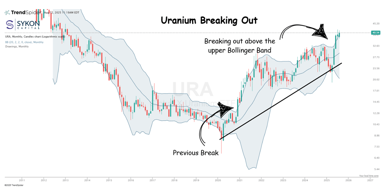 Back in June, I highlighted uranium’s breakout above the upper Bollinger Band as an early sign of sector strength. Since then, the move hasn’t faded, uranium continues to ride that upper band, showing strong, persistent momentum. The Global X Uranium ETF (URA) is leading the charge, supported by recent executive actions promoting deregulation in nuclear energy and what some are calling a “nuclear renaissance.”