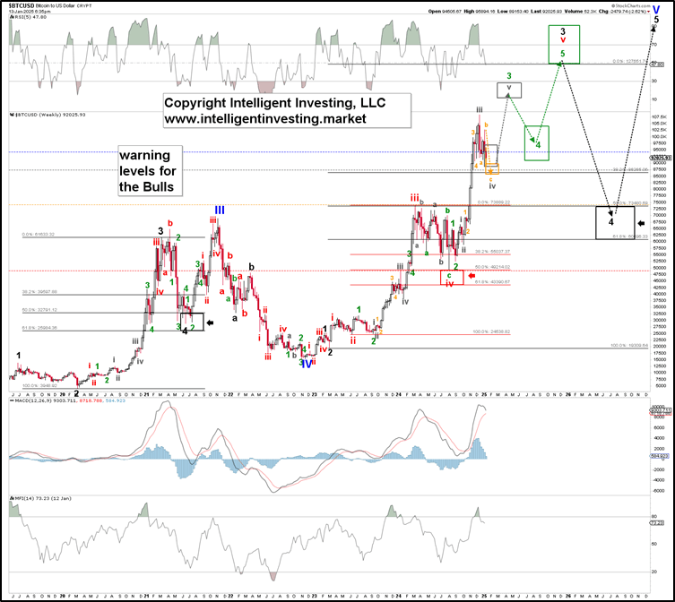 Fast-forward, and BTC peaked at $108369 four days after our article was published for the grey W-iii. It then dropped to $91310 on December 30th (orange W-a). It rallied to $102747 on January 7 (orange W-b); today, it fell to as low as $89153 (orange W-c). Thus, the grey W-iii was completed at the recent All-Time High, and the anticipated grey W-iv is now underway. So far, our forecast from a month ago is still on track. See Figure 1 below.