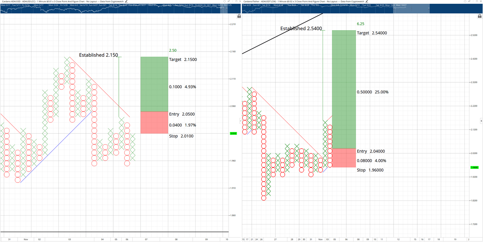 ADA/USD $0.01/3-box (left) and $0.02/3-box (right) Reversal Point and Figure Charts