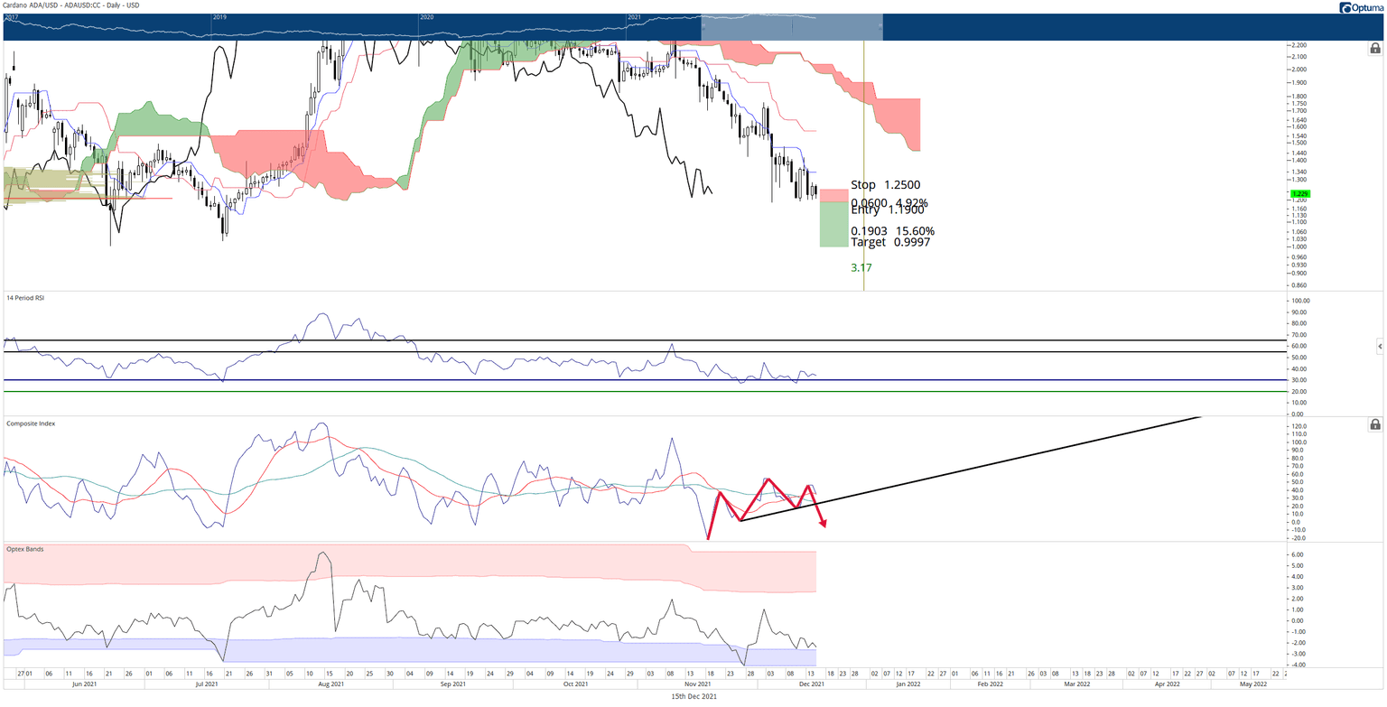 On the short side of the market, Cardano price has a hypothetical entry on its daily chart with a sell stop order at $1.19, a stop loss at $1.25, and a profit target at $1.00. The entry can only occur if there is a daily close at or slightly below the $1.19 price level. The short entry is based primarily on the head-and-shoulders pattern present on the Composite Index.