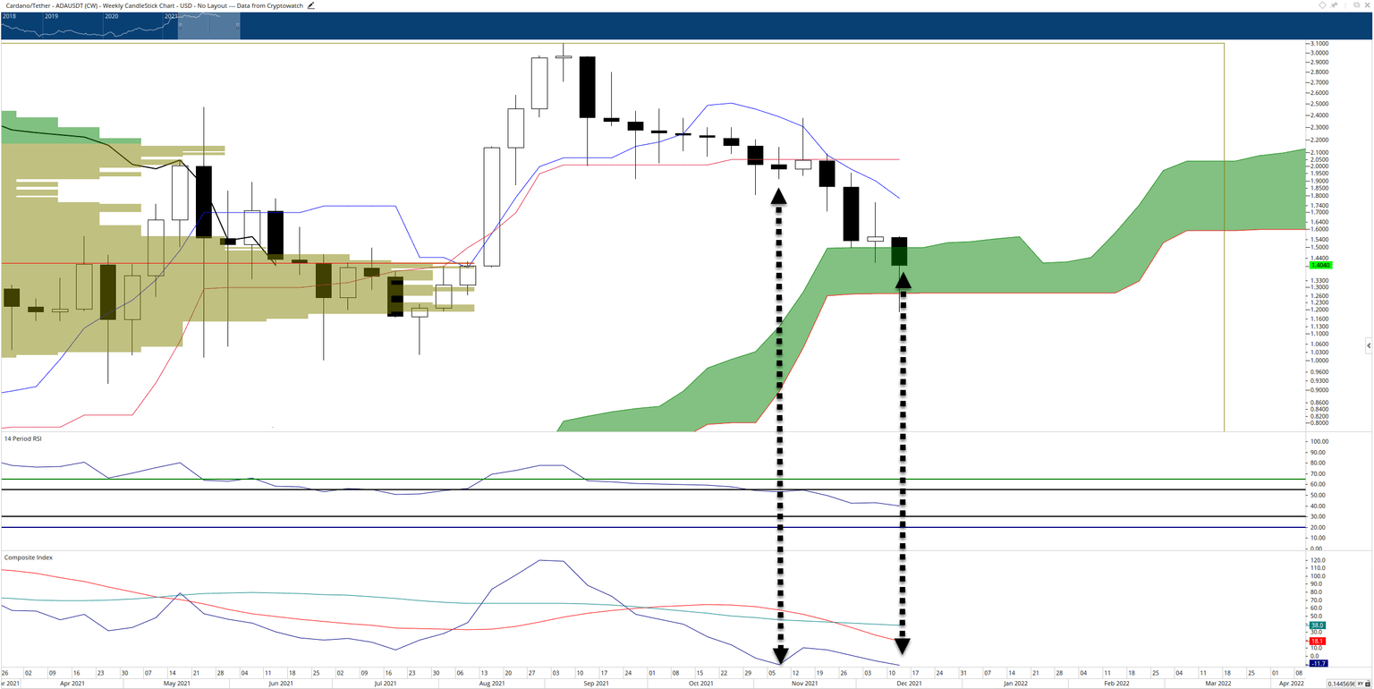 A decisive factor supporting the idea that Cardano will make a new bull run is the condition of the Composite Index. The arrows on the chart below point to the week of the November 5th swing low in the Composite Index (the second-lowest reading in Cardano’s history) and its corresponding candlestick directly above it and last week’s Composite Index line to its corresponding candlestick.