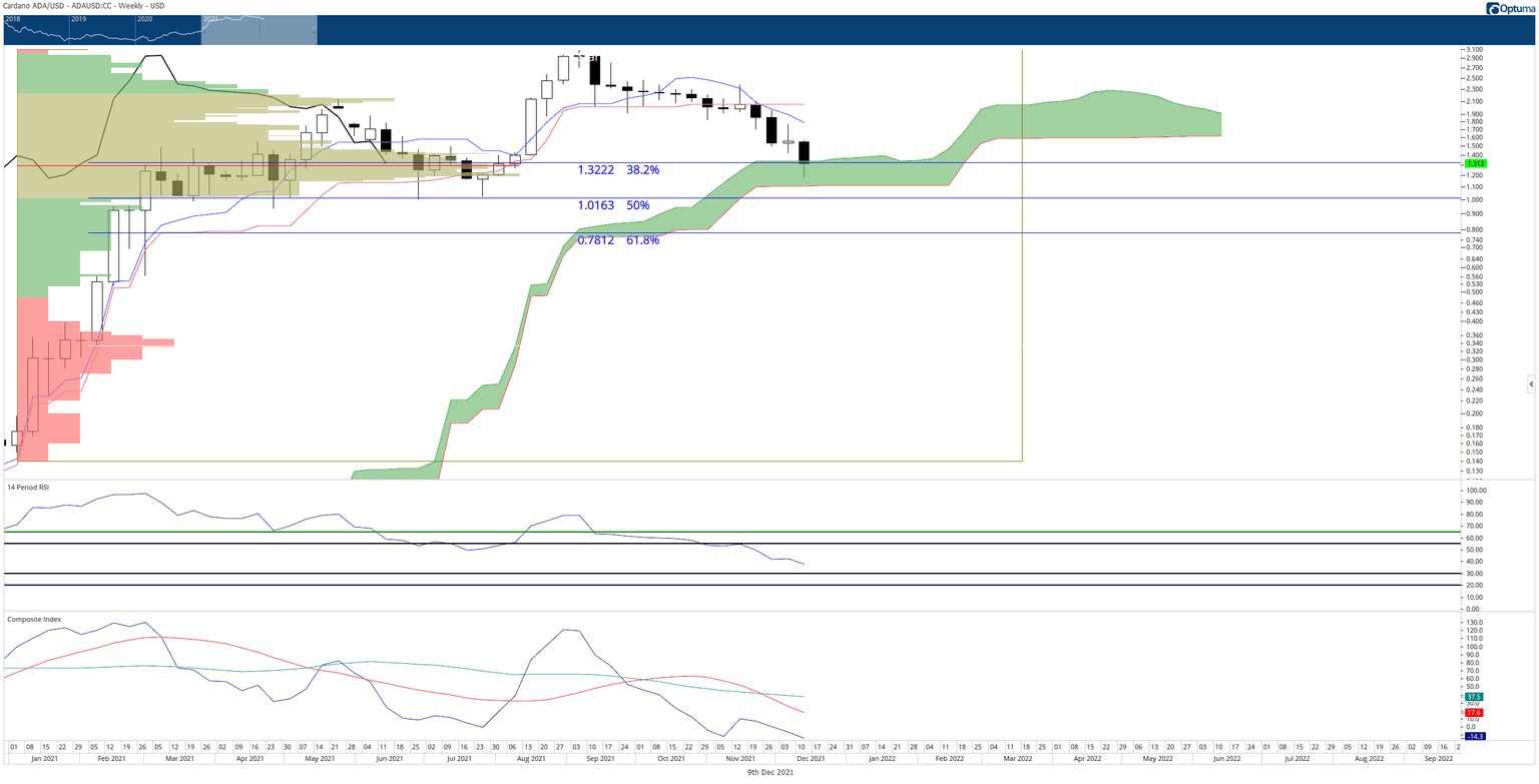 The most substantial combined level of support for Cardano is the $1.33 value area where the 2021 Volume Point Of Control and top of the weekly Cloud exist. Therefore, failure to hold the $1.33 zone would position Cardano at its final primary support level.
