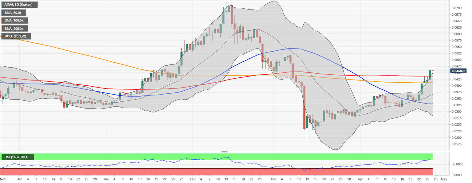 On the daily chart, ADA/USD has settled above SMA100 (currently at $0.0436) for the first time since March 8. While the bullish trend is intact as long as the price is above $0.0400 (daily SMA200), the coin may be ripe for a short-term downside correction as the RSI on the daily chart has entered the overbought territory. The initial support is created by the above-said SMA100. Once it is broken, the sell-off is likely to gain traction with the next focus on $0.0400 where new buyers should emerge and push the price back towards resistance levels.