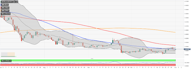 ADA topped at $0.0448 on October 28 and has been retreating ever since; however, the coin found strong support at $0.04. This psychological barrier is strengthened by the middle line of the Bollinger Band on a daily chart.