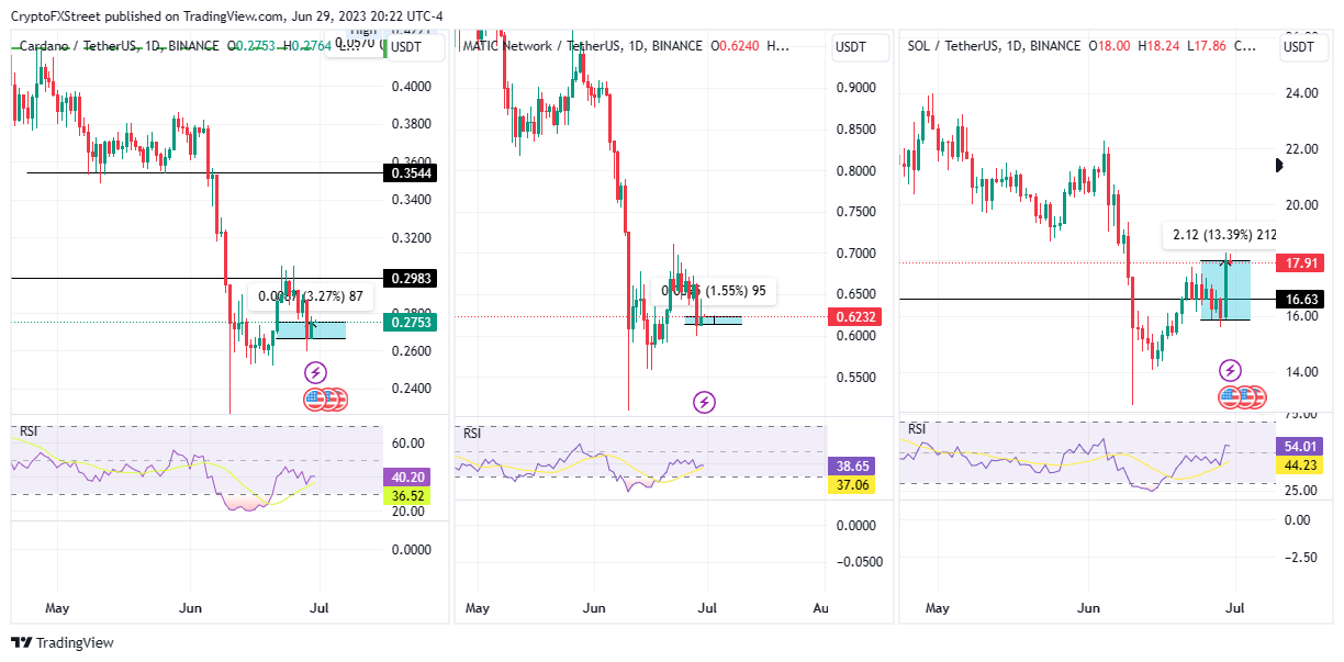 Undeterred, ADA, MATIC, and SOL are up 3.27%, 1.55%, and 13.39% in the last 24 hours, beating crypto market giants BTC and ETH, which are recording daily rises of 1.10% and 0.72%, respectively, at the time of writing.