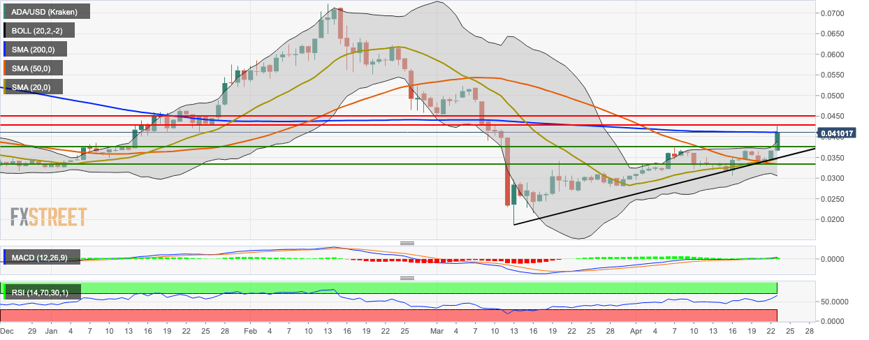 ADA/USD spiked up from $0.036 to $0.041 this Thursday as the bulls retained control for the third consecutive day. In the process, the price broke above both the pennant formation and the 20-day Bollinger Band. The latter shows that the asset is currently overvalued and may face bearish correction soon. The price faces immediate resistance at the SMA 200 curve. The MACD indicates increasing bullish momentum, while the RSI has spiked up and reached the edge of the overbought zone.