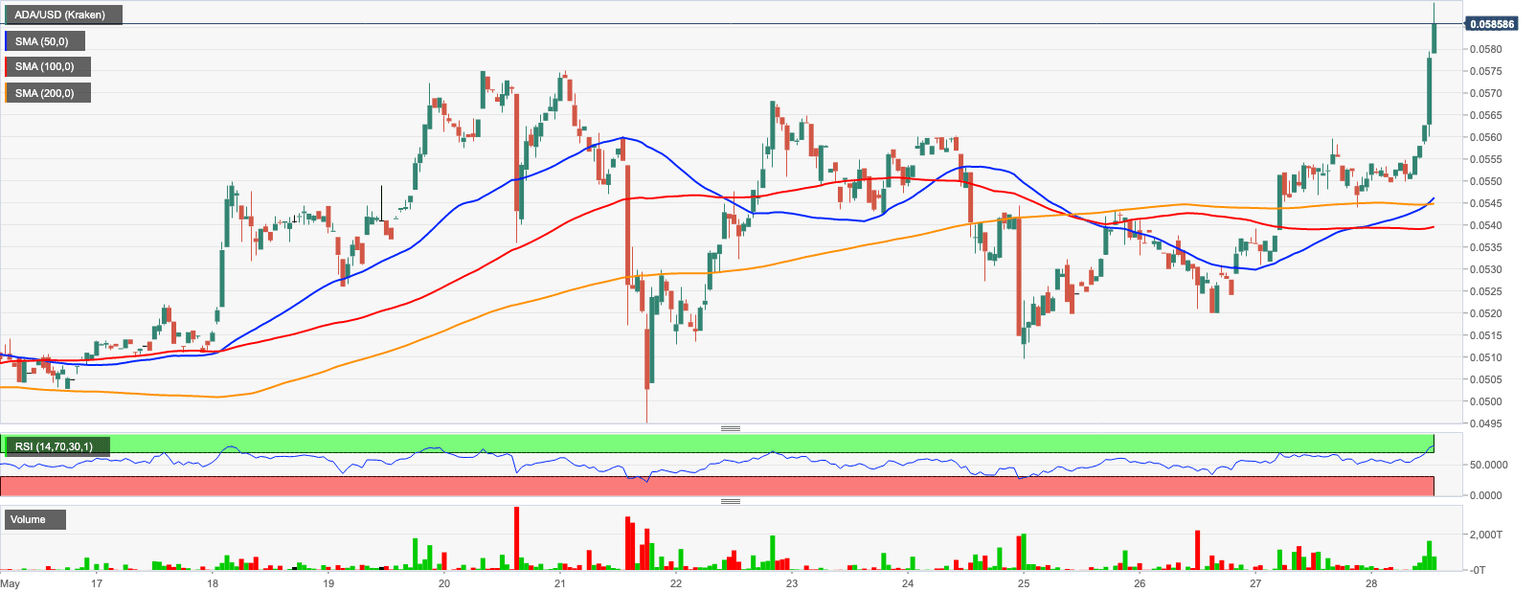 Cardano (ADA) is changing hands at $0.0590 amid strong bullish sentiments. The coin has gained over 1% in a matter of minutes and the upside trend is gaining traction. The coin has been oscillating in a tight range limited by $0.0555 on the upside an $0.0540 on the downside for the best part of the day.